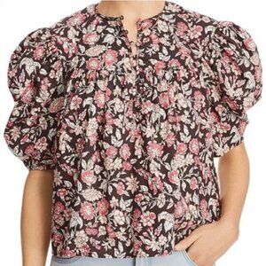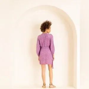 Mini length. Regular/relaxed at bust, fitted at waist, semi-fitted at skirt. Three-quarter length, puff sleeves. V neckline. Light gathering at sleeves, neckline and skirt. Wrap construction. Unlined, no sheerness. Lightweight, non-stretch soft fabric. 100% silk. Made in Indonesia. Hand wash cold (dry flat) or dry clean