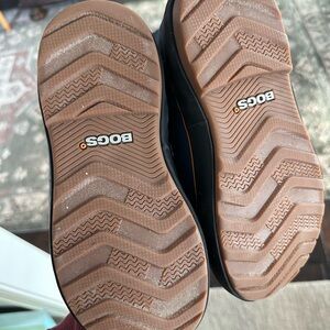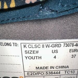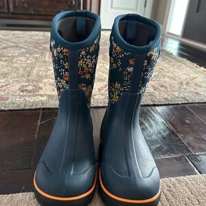 These stylish kids snow boots feature a vibrant floral design on a navy background. Perfect for snow days, they offer both comfort and durability. EUC.