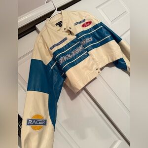 AKIRA Black Leather Jacket with Colorful Patches cropped