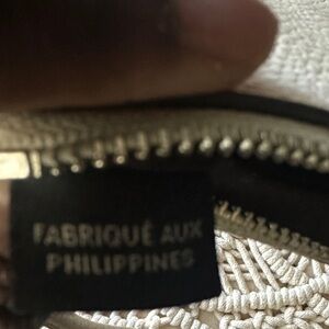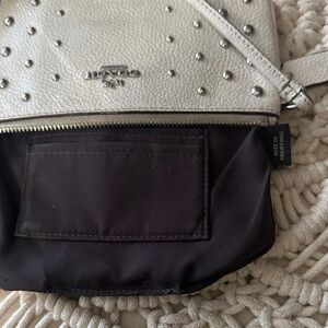 Chic Coach wristlet with metallic finish. Features studded accents. Ideal for versatile styling.