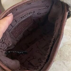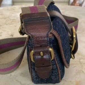 Fossil Mini Dark Wash Denim Crossbody Bag w/ Brown Leather Trim & Brass Details