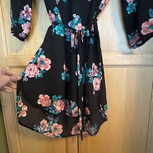 Chic black dress with pink and teal floral design. Features long sleeves and a tie waist. Slightly longer in the back, NWT.