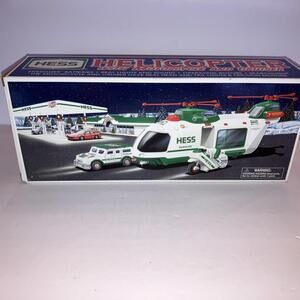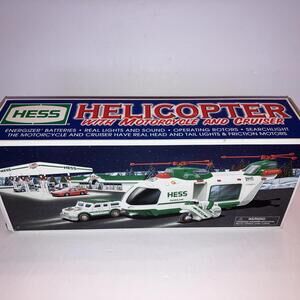 The product is a 2001 Hess toy truck featuring a toy helicopter, motorcycle, and cruiser, all new in the original box. The multi-color design is consistent with the brand's theme of gas and oil, making it a collectible item that appeals to fans of Hess merchandise. This set was manufactured in the 2000s and is an original piece, not a reproduction or modified item, adding to its value and appeal to collectors. New in box never out of box. Untested sold as is.