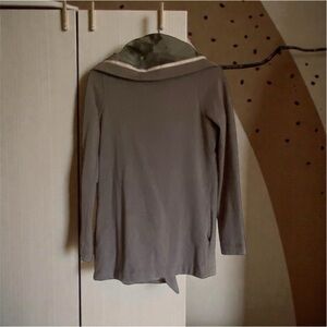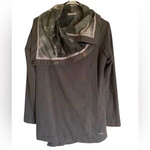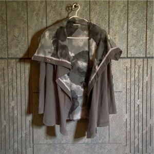 Style Tags: Lululemon Savasana Wrap, Vintage Lululemon Jacket, Gray Cloud Print Wrap, Asymmetrical Snap Cardigan, Yoga Layering Piece, Grey Cowl Neck Sweater, Lululemon Collector, Cozycore Athleisure, Travel Wrap Jacket.