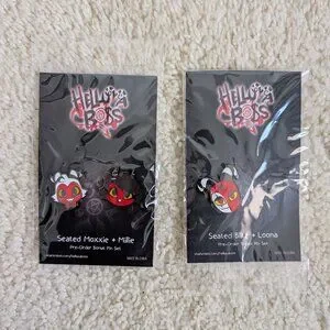 Add these soft and adorable plushies from the popular YouTube show Helluva Boss! Millie, Moxxie, and Blitzo in their seated plush style and include the limited edition pre order pins. Please note Loona pin not included. Received as a gift and brand new in packaging. First three images are of physical items. Last two pictures are the promotional images to see items without plastic. 😊