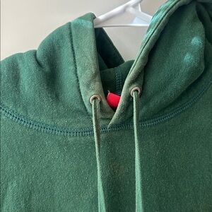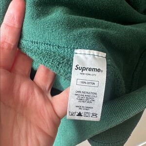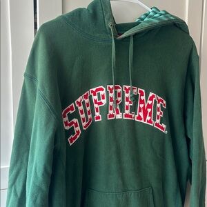 Bold Supreme logo on a dark green hoodie. Ideal for casual wear.