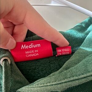 Used many times. Unisex size MEDIUM runs over size. Slight discoloration around the neck and hoodie area. PLEASE REFERENCE IMAGES FOR CONDITION