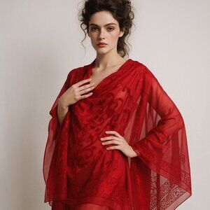 Vakko Silk Viscose Burnout Velvet Shawl Red Jewel Tone Scarf 45x41 NWT