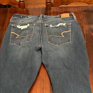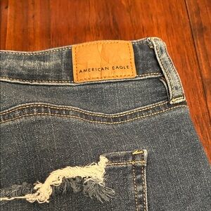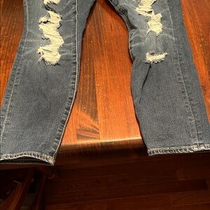 Stylish distressed jeans. Classic blue denim. Comfortable fit.
