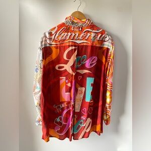 Bold button-up with swirling patterns. Features motivational text on the pocket.