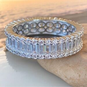 This stunning silver band ring features a dazzling array of CZs, perfect for adding a touch of elegance to any outfit. Absolutely stunning. In excellent condition.