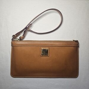 Chic brown leather wristlet by Dooney & Bourke. Features a sleek design with a secure zip closure.