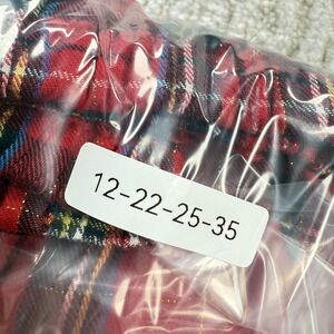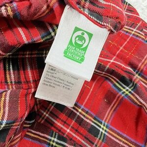 Color & pattern: Red tartan plaid with black, white, yellow, and blue lines plus subtle gold glitter thread throughout.