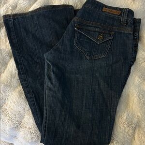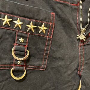 Stylish black flare pants with red accents. Features star details and metal rings. Perfect for a bold look straight outta the 90s!