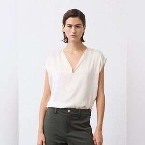 This elegant cream V-neck top is perfect for any occasion. Its sleek design offers a sophisticated look, making it a versatile addition to your wardrobe.