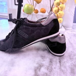 Sleek On Running shoes in black with pink accents. Ideal for running and casual wear. Wonderful shoe, retail $160, one shoe has minor damage due to a hot flat iron packed in my weekender bag and slightly melted the edge, not impacting the integrity of shoe. My loss your win! Check out pics the shoe is flawless, otherwise!
