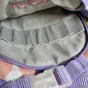 This pottery barn kids vibrant backpack features a playful heart design in purple, green, pink, and cream. Name embroidered on front. See all pics for wear signs