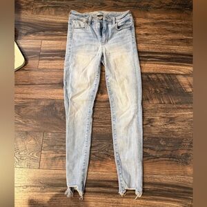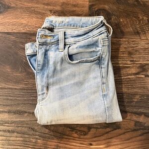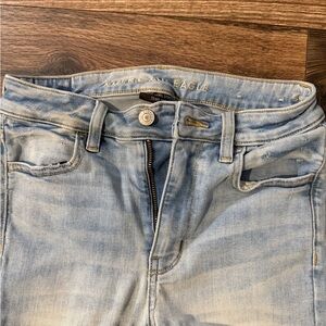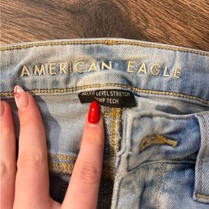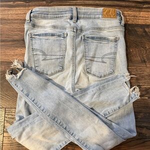 American Eagle next level stretch, high-rise skinny jean size 2 short. Light wash frayed bottom. In great used condition.