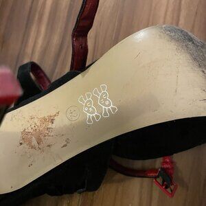 Iron Fist stylish black heels with striking red accents. Unique lightnings cutout design. Cross strap closure. The black fabric feels like suede.