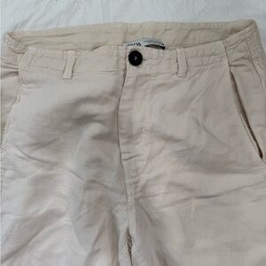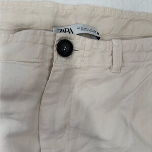 These Zara tan chinos offer a classic and versatile style, crafted from a comfortable cotton-blend material. With a relaxed fit and ankle-length cut, they are perfect for casual wear. The subtle texture adds a touch of sophistication to these timeless pants.