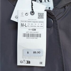 Zara “The Amanda” oversized raincoat in charcoal gray. Hooded with snap front closure and two large front pockets. Full-length/longline fit. Size M/L. Retail $89.90 (tag shown). Smoke-free home; ships within 2 business days.