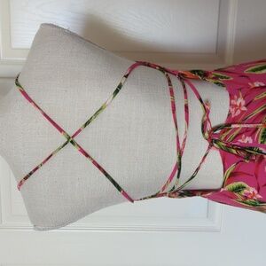 Nicole is a maxi dress featuring a stunning tropical print on poly fabrication. It has a V-neckline, flirty side slit, adjustable spaghetti straps that crisscross and ties at the open back.