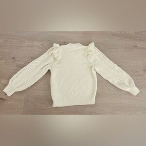 We took a classic cableknit crewneck and added a couple of feminine touches, like bubble sleeves and ruffles at the shoulder-this one's your going-out sweater.
