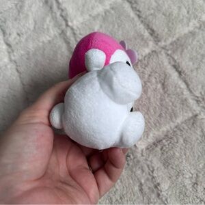 Details: Charming plush bunny with a pink head and white body. Features a cute flower detail. Kawaii style, anime, hello kitty friend!