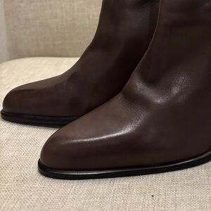 Vintage 90s Nine West Dark Chocolate Espresso Brown Leather Ankle Boots. Classic silhouette with a sharp pointed toe and a stable, tapered heel. Sleek minimalist design with a rear zipper closure. Buttery smooth quality genuine leather upper. Manmade lining has deterioration at the ankle. Office siren 1990s chic. Heel Height: Approx. 3.5" inches. See measurements in photos.