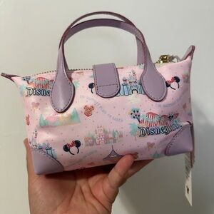 Charming mini bag with whimsical designs. Features pink and lavender tones. Perfect for adding a playful touch.