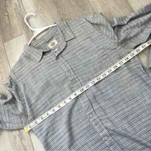 Marine Layer Classic Selvage Shirt in the color Blue. Collared, button front, long sleeve, single chest pocket. Medium weight, non-stretch, breathable fabric. Striped print. Size medium, mens. In pre-worn condition as it does have some light staining at underarms as shown in photos. 100% cotton. Perfect preppy, classic, date night, office, work, business casual style.