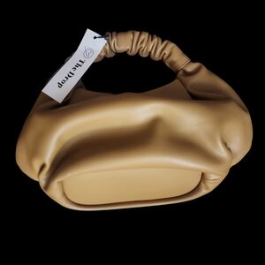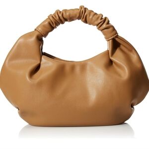 This bag has a 3.5" strap drop, smooth faux leather and a ruched top handle.