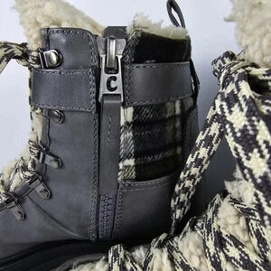 Circus by Sam Edelman Women's Gretchen Shearling Hiker Boot 8M. High style has never felt so good. Our Gretchen Fuzzy Hiker Bootie is an upgraded version of traditional hiking footwear with a soft shearling panel and criss-cross lacing Lug Sole Fuzzy Hiking Bootie Closure: Zipper Toe: Round Heel Height: 1.5 inches Material: Microsuede and Faux Shearling, Vegan Leather and Faux Fur, or Vegan Leather with Fabric and Faux Shearling Lining: Synthetic