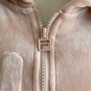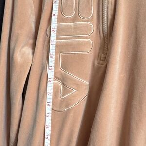 Cozy velour FILA hoodie in mauve, pink. Features a half-zip, 2 pockets and has an embossed vertical logo on front. 22 pit to pit. Very stretchy to 26 inches. Same with shoulder to hem. size small, but easily a medium.