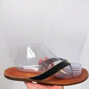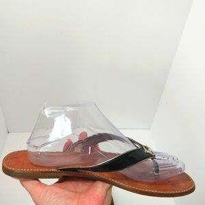 Coach Deney Patent Leather Flip Flops, Size 9.5, black, leather, pre-owned, great condition, light wear, photos taken, clean no odors, insole toe to heel 10", widest part of toe 3.5", photos show true condition of shoes