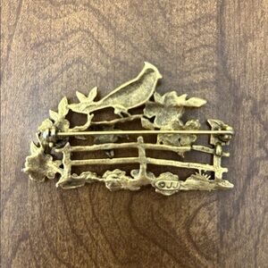 Charming Vintage brooch featuring a red cardinal perched on a fence with flowers.