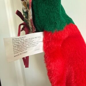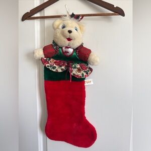 Celebrate the holidays with this charming red and green stocking featuring an adorable bear. Perfect for adding a festive touch to your home decor.
