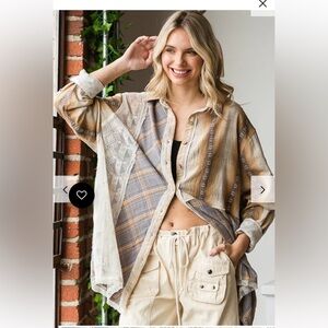 Chic oversized washed plaid shirt. Features a blend of blue, brown, and cream. Ideal for layering.