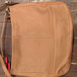 Soft and supple, camel color Pebble leather. removable crossbody strap.