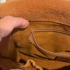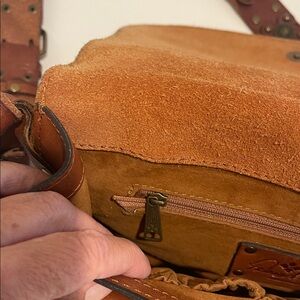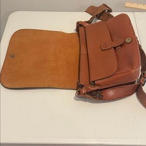 Crafted from high-quality Medium brown, leather this Crossbody/messenger by Patricia Nash. Features a studded strap for a unique look. Soft buttery leather exterior with soft creamy suede interior many compartments. Magnetic snap close , two exterior compartments one with credit card holder. Interior zipper pocket two elastic slide in pockets. Slight flaw in stitching by interior zipper compartment as pointed out in photos. Zipper works fine.
