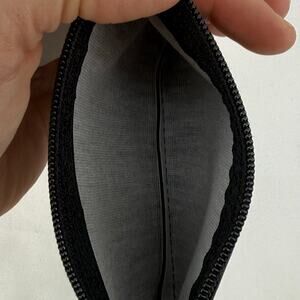 Small but bold black mini zip pouch made of smooth faux leather with white lettering. Perfect for coins, cash, lip balm, earbuds, or tossing into a larger bag.