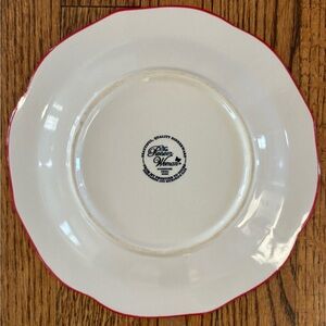 Charming salad plates with red edges and blue floral design. Ideal for casual or formal dining.