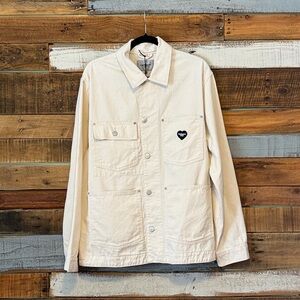 Meet the jacket that’s ready for anything—crafted in sturdy cotton-twill with pockets galore and a roomy, ready-for-adventure fit. Up front, a cheeky heart-shaped button and logo-embroidered heart wink from the chest, proving that utility and charm make the perfect match.