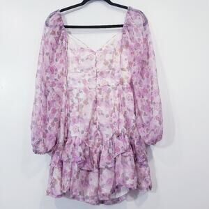 Chic floral mini dress with puff sleeves. Features a delicate floral pattern in pink and purple hues.