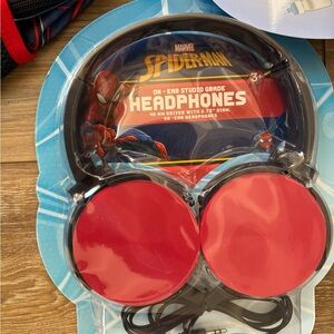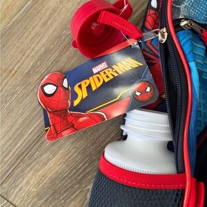 Spider-Man themed backpack with lunchbox, headphones and water bottle. Blue and white web design. Marvel branding. Brand new with tags.