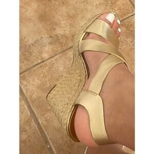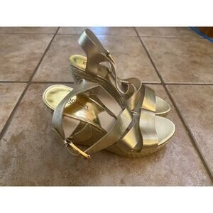 MICHAEL KORS Metallic Gold Leather Ankle Strap Espadrille Wedge Sandal 9.5M. There are no rips, tears, or damage to the soles. Please see the pictures for the condition. There are signs of wear, such as creasing and scuffs, and scratches from normal wear. Metallic Gold leather upper, Adjustable buckle ankle strap for easy on/off, Leather/Synthetic lining, Open toe, strappy construction .75" platform, Approximately 4.25" jute wedge heel height, Synthetic outsole