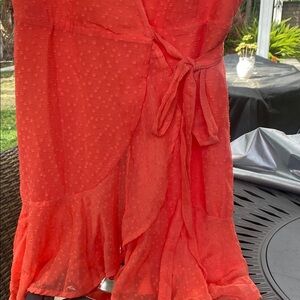 Elegant coral wrap dress. Features flutter sleeves. Wraps around and ties to the side. Perfect for any occasion. New, never worn.