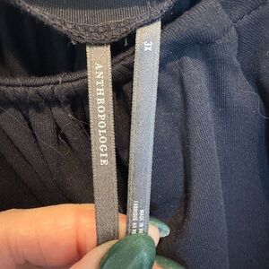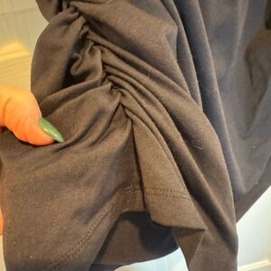 Chic black blouse with a relaxed ruched fit. Features gathered neckline and short sleeves. Ideal for versatile styling. Can be dressed up or down. Solid black with ruched sleeves and sides. Amazing stretchy polymide elastane material blend. Good condition. Anthropologie size 3X. True to size but can also fit 2X.l if you don’t want it so fitted.