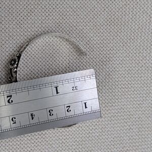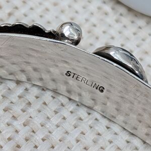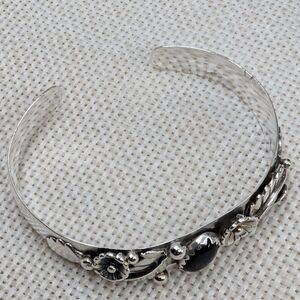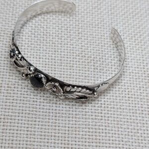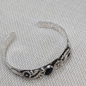 Stunning vintage sterling silver cuff bracelet by Florida Keys artisan silversmith BHJ. Features beautiful ornate detailing with genuine black onyx cabochon centerpiece and intricate floral/leaf scrollwork.