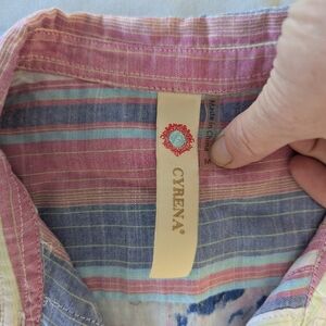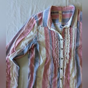 Medium button up striped, embroidered shirt from Cyrena for Anthropologie. Floral bird embroidered detailing on back. Ruffle front. Button tabs for rolling sleeves.